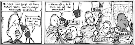 Some guys I work with recently re-wired our main network closet. It was a huge effort to set-up and complete with little to no impact on our network. The actual re-wire took about 20 hours (straight) to complete, but took 2 months to prepare. I drew this cartoon for the company newsletter to recognize their efforts.
